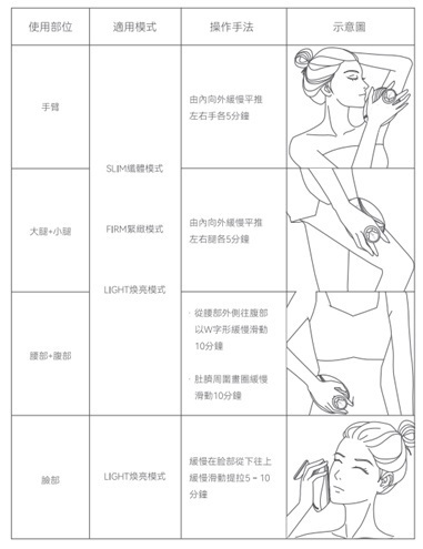 ✨模式:3個模式,SLIM纖體模式、FIRM緊緻模式、LIGHT煥亮模式